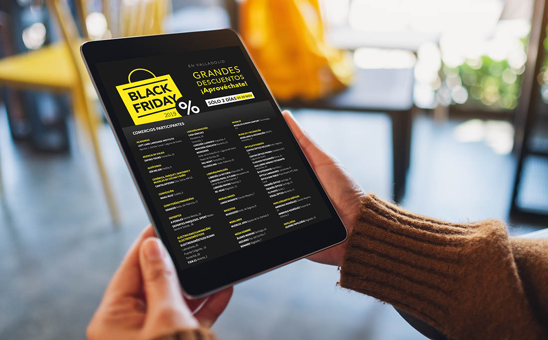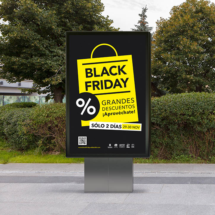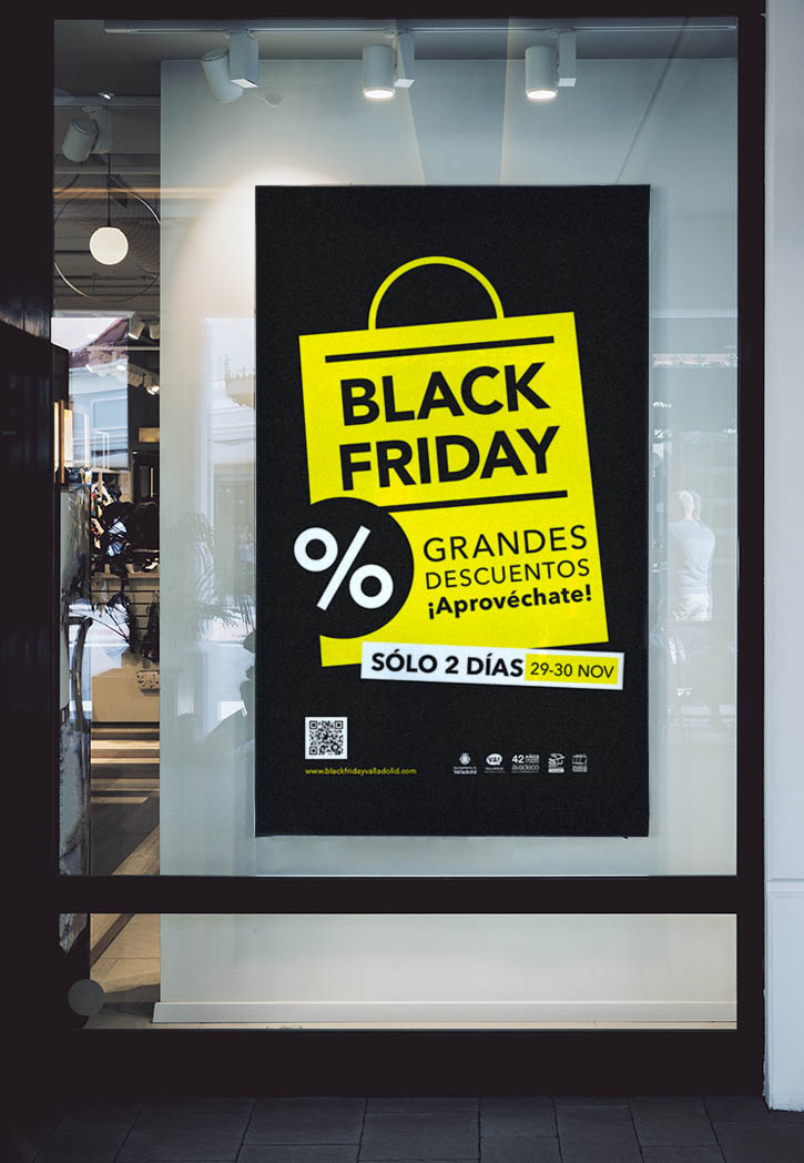 Campaña diseñada para el Black Friday en Valladolid orientada a incentivar las ventas del pequeño comercio, utilizando como color principal el negro, por razones evidentes, se buscó un contrapunto usando el amarillo. Una buena combinación para llamar la atención del espectador.