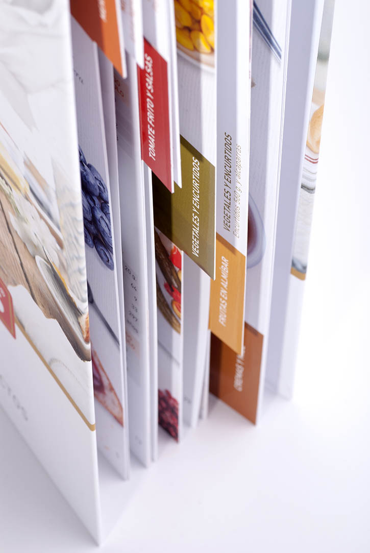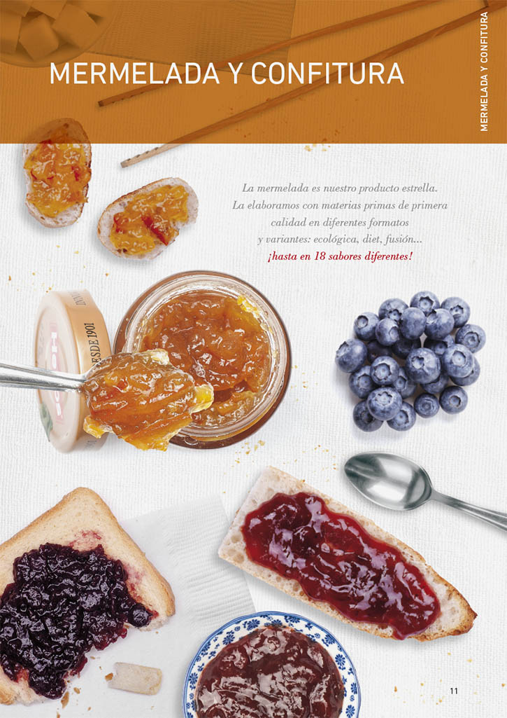 Para diferenciar los distintos grupos de productos en los que trabaja la empresa ideamos un sistema de pestañas de colores que facilitasen su identificación de manera intuitiva. Además, las fotografías de bodegón convertidas en mockups nos sirvieron para diseñar las portadillas de cada sección. Dándole además, un aspecto amable y acogedor, recreando una mesa de desayuno (o merienda) desde un punto de vista cenital. Por otro lado, hablando de una marca de estas características, siempre debe estar presente un factor esencial: que la imagen sea apetecible.
