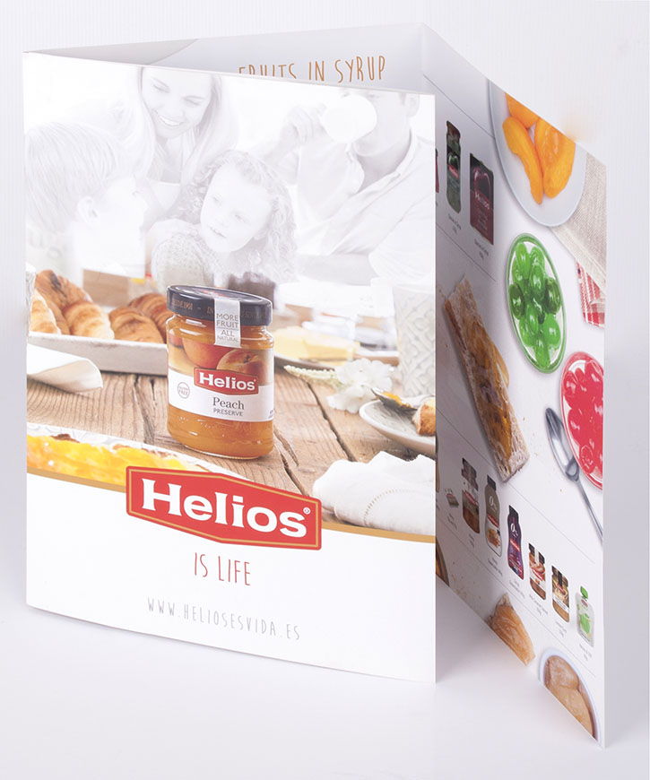 A la vez que el catálogo comercial, con todos los productos, diseñamos un resumen en formato de cuadríptico con un aspecto más publicitario que servía como pieza promocional del Grupo Helios. Además, era importante que estas piezas tuvieran una coherencia estética con el resto así como con la marca.