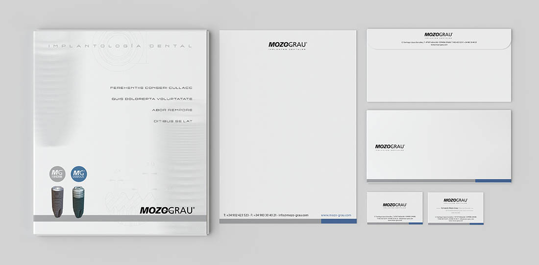 Mozo-Grau no era el típico cliente con el que se empezaba de cero sino que tenía una imagen y una serie de piezas gráficas muy marcadas previamente. Hubo un periodo de transición en el que utilizamos su antigua imagen y poco a poco fuimos llevándola a nuestro terreno, hasta llegar a cambiar la imagen gráfica de sus piezas sin tocar el logo original. Su azul corporativo dio paso al blanco y negro, blanco para transmitir limpieza (al pertenecer al sector sanitario) y negro para transmitir sofisticación. Todo ello con juego minimalistas de elementos que nos ayudaba a proyectar una imagen de una empresa «fina» y precisa.